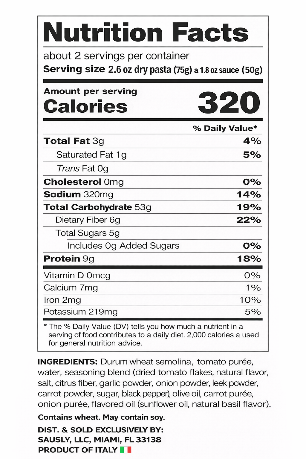Durum wheat semolina, tomato purée, water, seasoning blend (dried tomato flakes, natural flavor, salt, citrus fiber, garlic powder, onion powder, leek powder, carrot powder, sugar, black pepper), olive oil, carrot purée, onion purée, flavored oil (sunflower oil, natural basil flavor).
