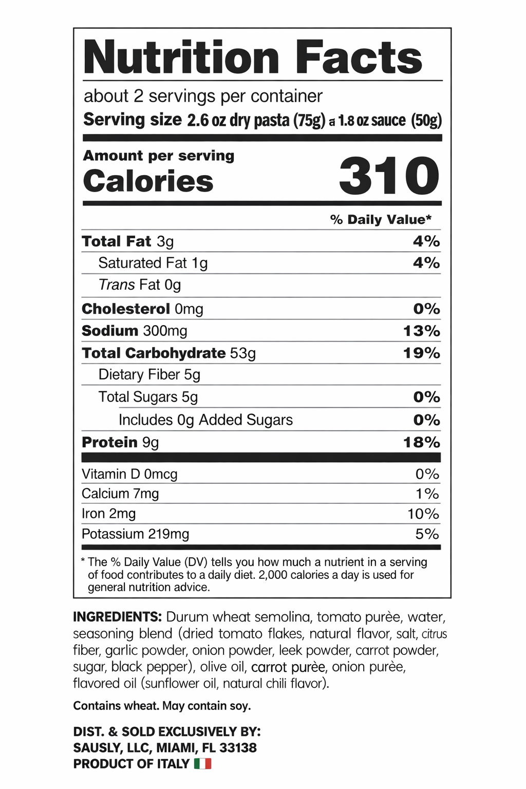 Durum wheat semolina, tomato purée, water, seasoning blend (dried tomato flakes, natural flavor, salt, citrus fiber, garlic powder, onion powder, leek powder, carrot powder, sugar, black pepper), olive oil, carrot purée, onion purée, flavored oil (sunflower oil, natural basil flavor).